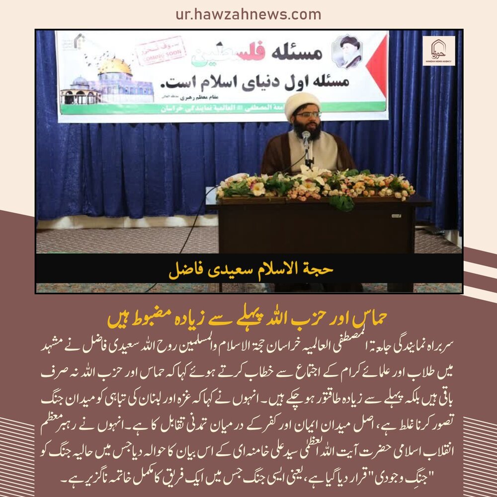 حماس اور حزب اللہ پہلے سے زیادہ مضبوط ہیں: حجۃ الاسلام سعیدی فاضل