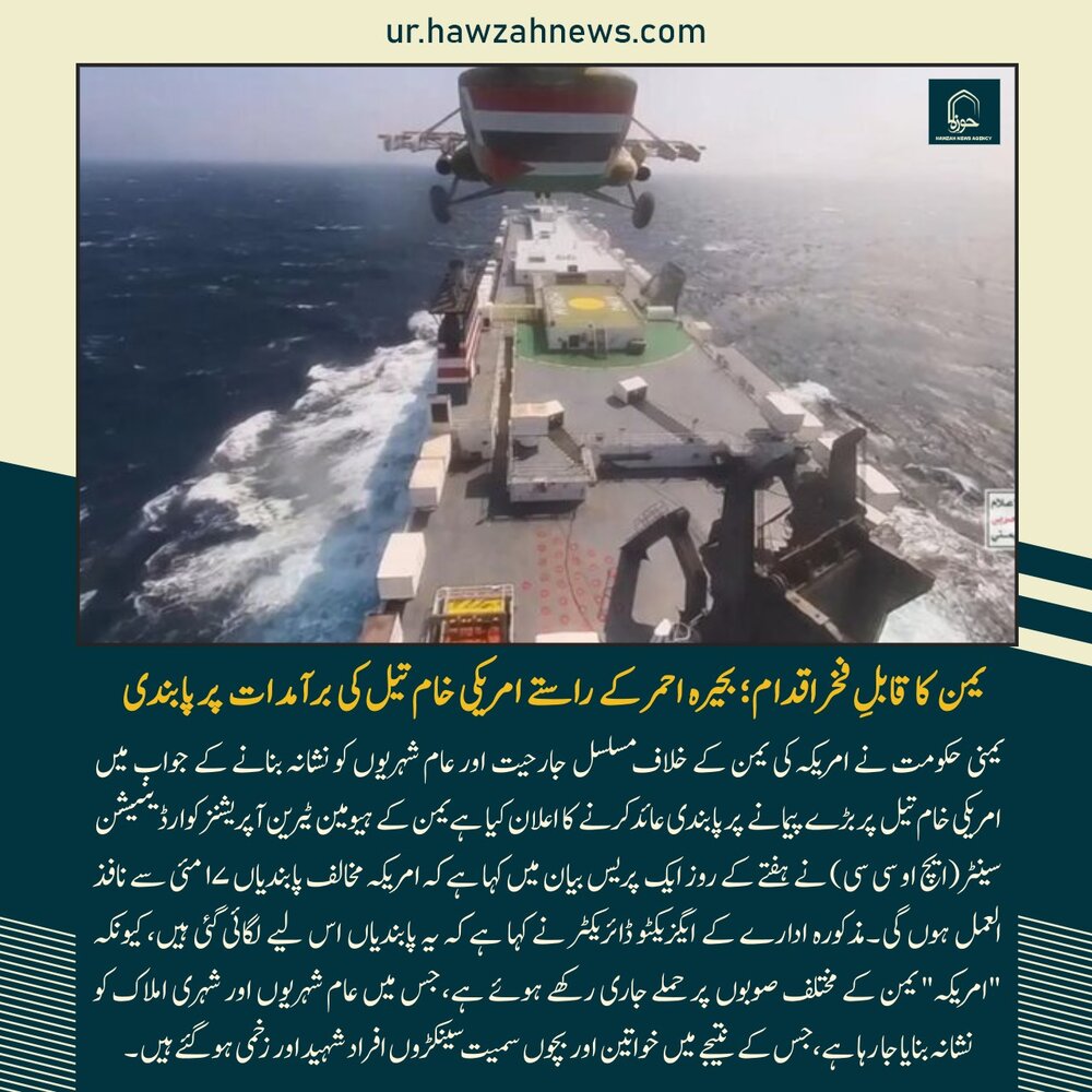 حوزہ/ یمنی حکومت نے امریکہ کی مسلسل جارحیت اور عام شہریوں اور شہری انفراسٹرکچر کو نشانہ بنانے کے جواب میں امریکی خام تیل پر بڑے پیمانے پر پابندی عائد کرنے…